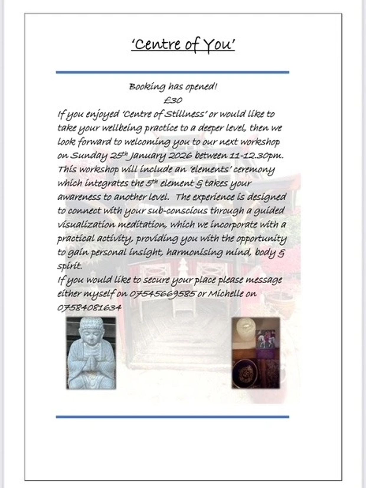 'Centre of You’ is the next level programme guiding you to connect your mind, body & spirit. Relaxation provides the basis for a deep inner visualisation meditation enabling reflection & insight reconnecting you to the core of you!